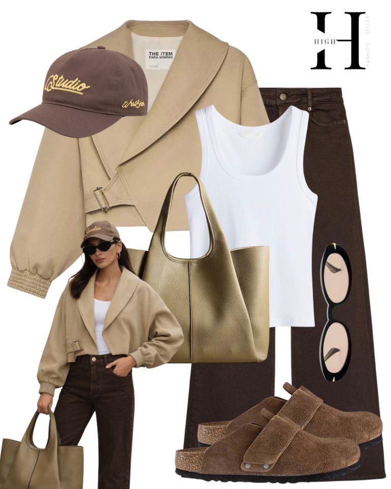 In the spectrum of brown, there exists an entire universe of nuance. This look navigates those shades with intention: the cropped camel jacket, with its wide lapels and cinched waist, creates a frame for the simple white tank beneath. Dark…