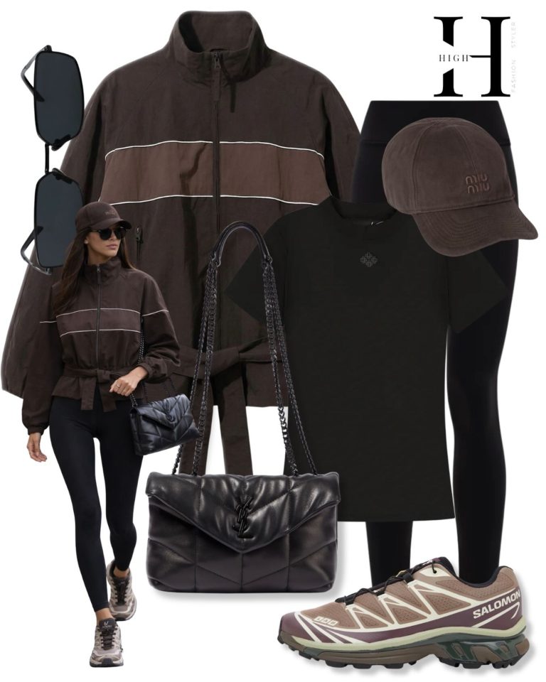 The brown windbreaker, striped with white horizontals, arrives as a relic of sportswear history reimagined for the contemporary wardrobe. Its high neck and cinched waist create structure without stiffness. Beneath, a black tee and black leggings form a monochromatic base…
