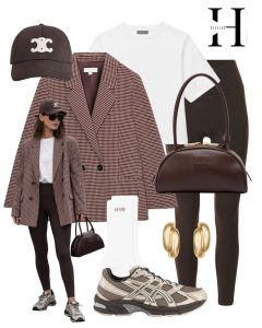 The Miu Miu cap, in matching brown suede, adds luxury punctuation. The YSL quilted leather bag—with its chain strap and chevron stitching—brings Parisian polish to athletic ease. Salomon trainers, in brown and burgundy, anchor the look in functional cool.