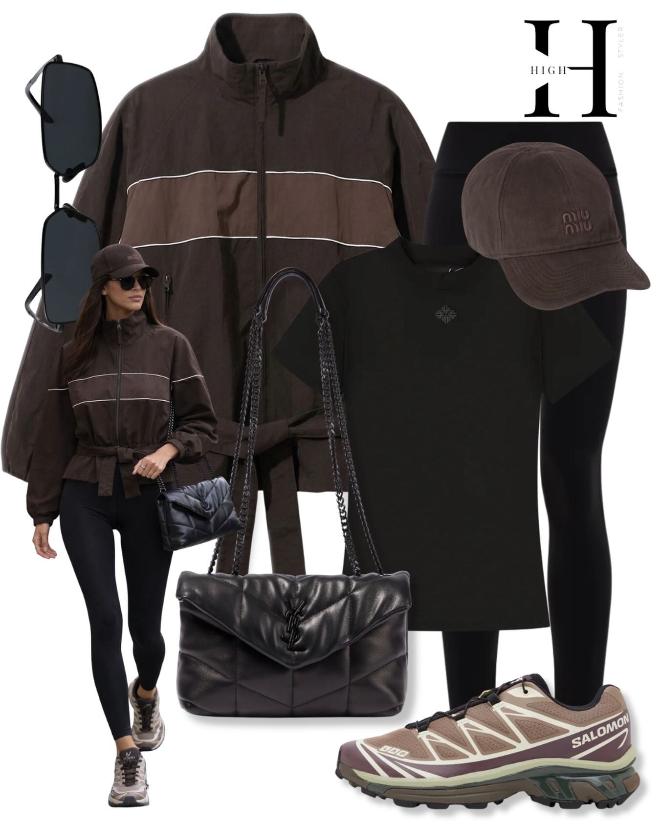 The brown windbreaker, striped with white horizontals, arrives as a relic of sportswear history reimagined for the contemporary wardrobe. Its high neck and cinched waist create structure without stiffness. Beneath, a black tee and black leggings form a monochromatic base that lets the jacket take center stage.